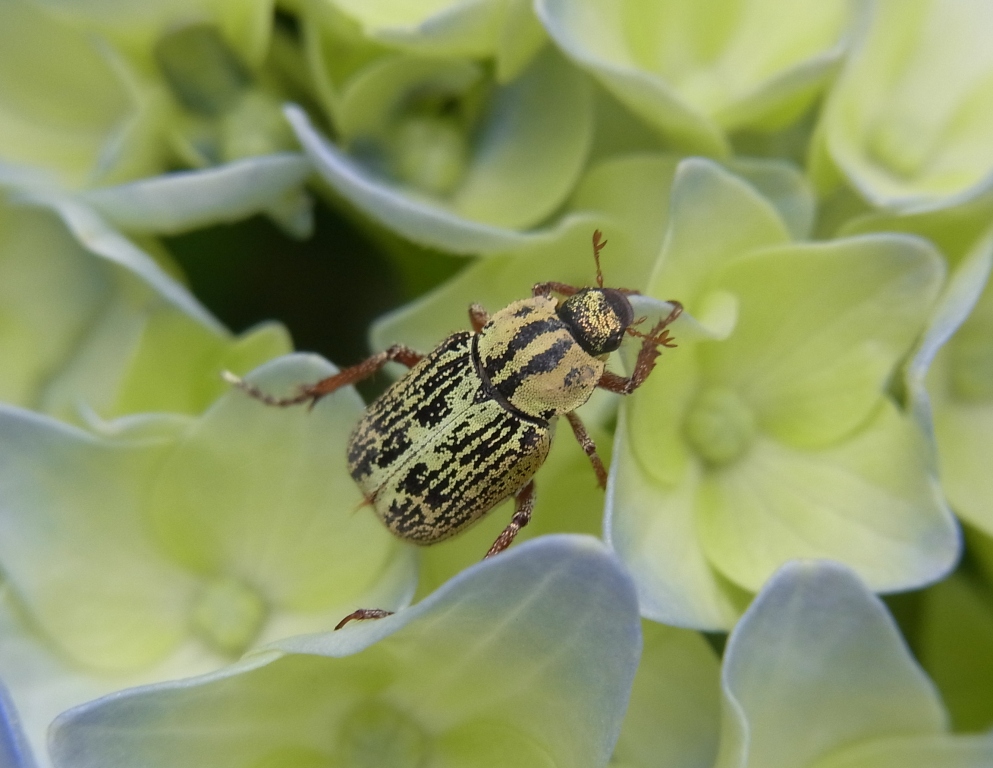 | アジサイに来ていたヒメアシナガコガネ。持ち帰って図鑑で確認。 |