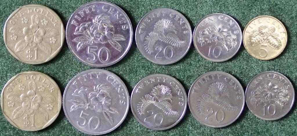 | これはシンガポールのコイン。上の段はI氏から頂いたものとか。 下の段と下の紙幣は、ムスメがシンガポールに行った際に入手したとか。 コイン、年度によって僅かに紋章のデザインに違いがあります。裏?はシンガポールを代表する?花や植物がデザインされています。 |